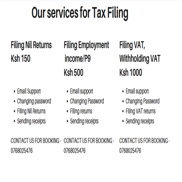 Wedo tax filing at different prices depending on theservice. forfiling nil returns, it costs Ksh 150, for Income, Withholding, statutory deductions like SHA,PAYE, Filing for income tax, we charge Ksh 500. For VAT and other tax filing services we charge Ksh. 1,000